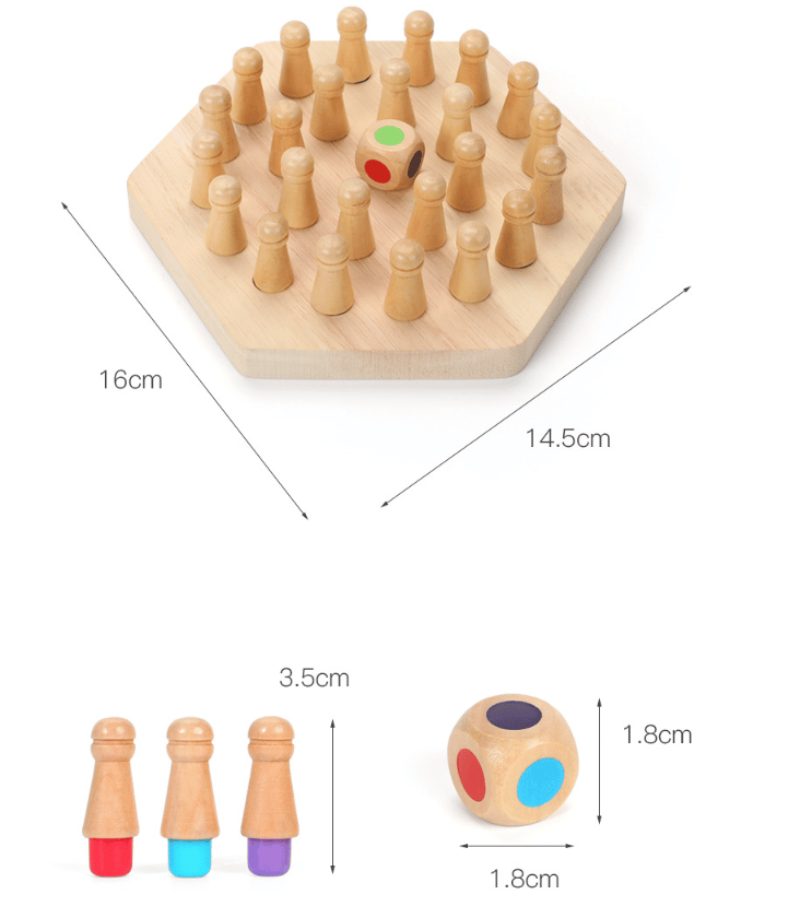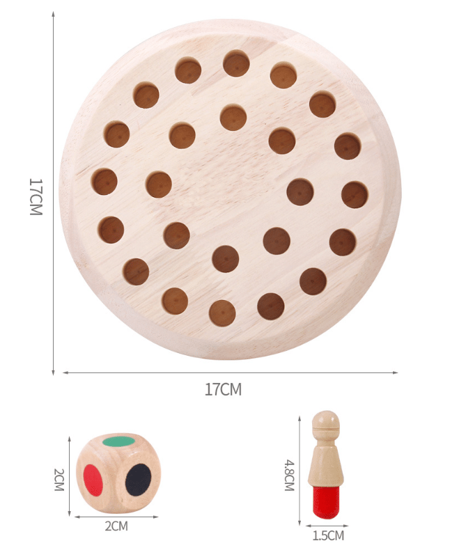 - 1 x Wooden Memory Match Stick Chess Game( 1 round wooden base with 24 holes, 1 multi-color wooden dice, 24 wooden color pegs (4x white, 4x green, 4x yellow, 4x blue, 4x black, 4x red). Non-toxic and safe water paint is used on the pieces)